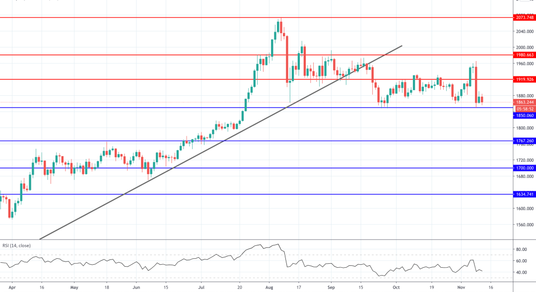 本周金价遭抛售,市场回落至1919.92下方。目前,1850.06的水平继续支撑价格。